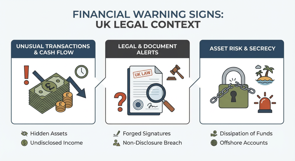 - Large, sudden expenditures before or during divorce proceedings